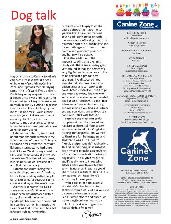 Canine Zone of South Africa is a bi-monthly magazine for all dog lovers. Featuring real stories about dogs and their owners, rescued dogs and hero dogs, health, behaviour and general advice along with interesting and educational feature stories, product reviews, what' new on the pet care market, Rescue Stars, dog loving celebrities and dogs up for adoption. This jam-packed magazine is a must for all dog lovers.