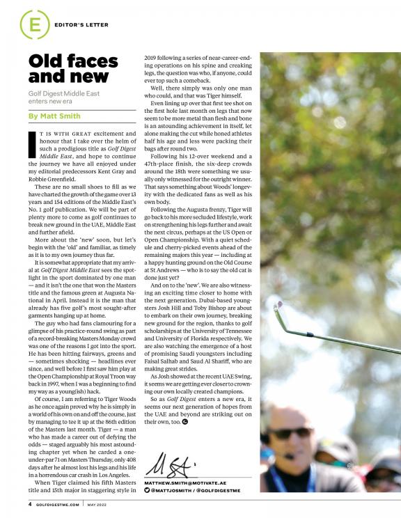 Golf Digest Middle East is the leading golf publication in the region and the biggest golf magazine brand globally. Featuring a blend of local and international content, Golf Digest Middle East is essential reading for the passionate golfer - combining expert tuition from the world's leading tour professionals with the latest in equipment, news and travel.