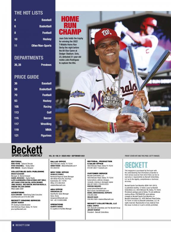 Beckett Sports Card Monthly is a monthly magazine loaded with everything you need to know about new all sports, non-sports, gaming cards and more. It offers news, values for new releases as well as past sets along with the latest collecting trends. Our readers use this magazine to find out what's new, what their cards are worth, who's hot, who's not and more. For veterans and novices, Beckett Sports Card Monthly is a must-have resource to stay informed and aware of the hobby. What to expect in each issue: • Editorial coverage: A mix of news, features and opinion pieces covering what’s new and what’s interesting in the hobby along with insight on how and what to collect. • Previews: All you need to know about upcoming card sets. • Reviews: Breakdowns and opinions of the newest card releases. • The Hot List: A visual list and values for the 20 hottest cards on the market. • The Price Guide: More than 200 pages filled with price ranges for new releases and past sets. • Market Watch: A look at the key players and products to collect.