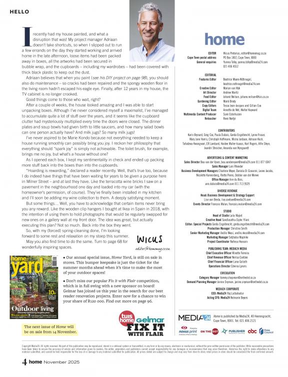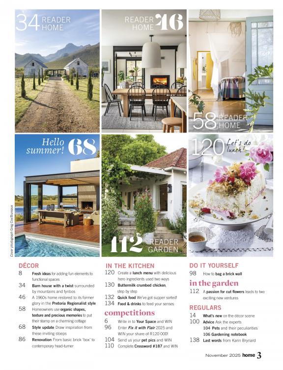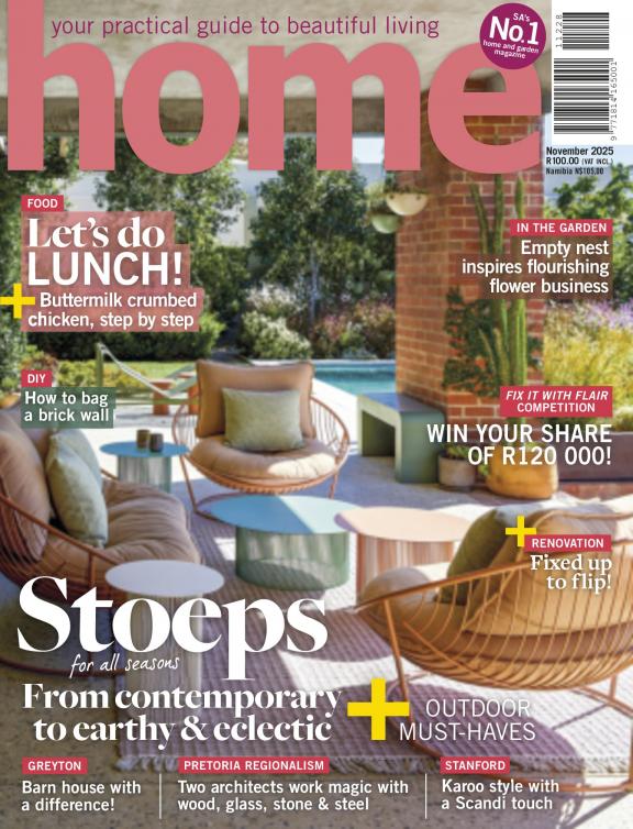 Home South Africa is a practical, inspiring guide for the home and garden that enables people to make their home prettier and increase the value – inside and outside. The magazine makes life easier for people wanting to buy a home, build, or make alterations, or even try their hand at gardening, cooking and decorating. Home doesn't just demonstrate what looks good – it explains what adds value, and why. The magazine offers readers affordable and accessible choices, help with do-it-yourself projects, and provide advice for renovations. It’s for men and women with ordinary lives, ordinary careers and ordinary homes; people who want to add value to their home with a limited budget.