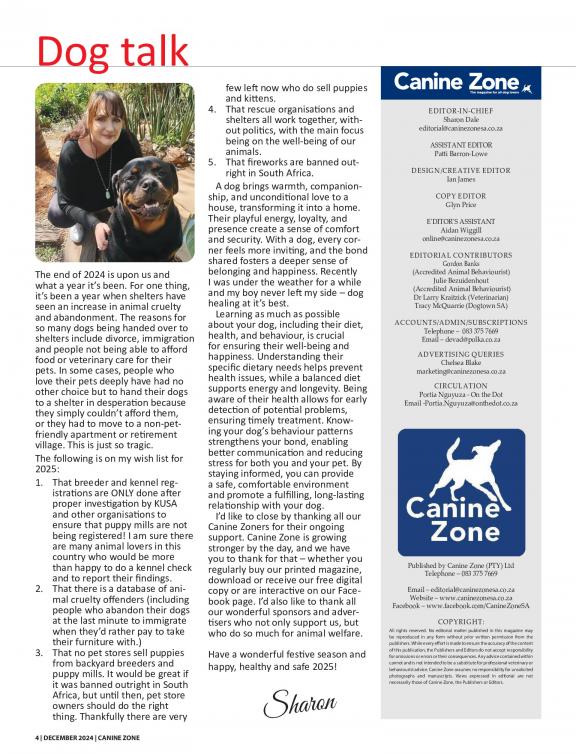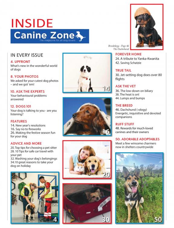 Canine Zone of South Africa is a bi-monthly magazine for all dog lovers. Featuring real stories about dogs and their owners, rescued dogs and hero dogs, health, behaviour and general advice along with interesting and educational feature stories, product reviews, what' new on the pet care market, Rescue Stars, dog loving celebrities and dogs up for adoption. This jam-packed magazine is a must for all dog lovers.