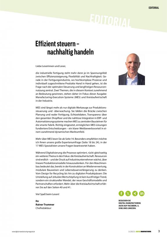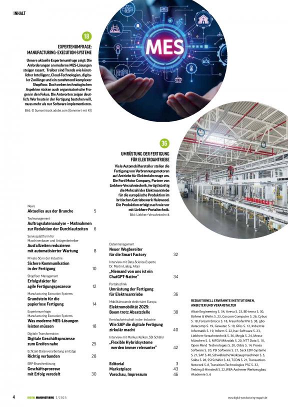 Im Mittelpunkt von DIGITAL MANUFACTURING stehen Grundlagen, Methoden, technische Trends, IT-Lösungen sowie praxisnahe Anwendungsbeispiele aus dem Bereich der digitalen Prozesskette in der Produktion. Das Magazin vermittelt, welche Produktivitätsvorteile sich in der Produktion durch die richtigen Strategien und Lösungen erzielen lassen.