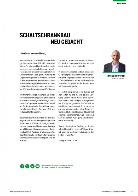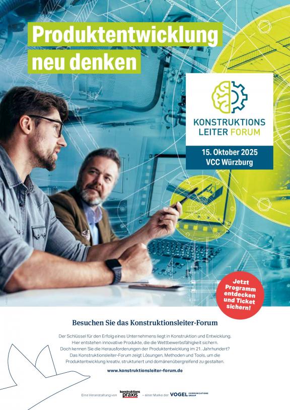 Das Fachmagazin für den Konstruktions- und Engineering-Bereich berichtet über alle Aspekte, die bei der integrierten (ganzheitlichen) Produktentwicklung wichtig sind. Im Mittelpunkt stehen Lösungen und Strategien für ein leistungsfähiges Engineering sowie Innovationen aus der Antriebstechnik, Automation, E-Technik, Fluidtechnik, Verbindungstechnik und Konstruktionsbauteile.
