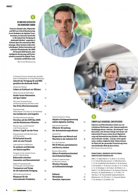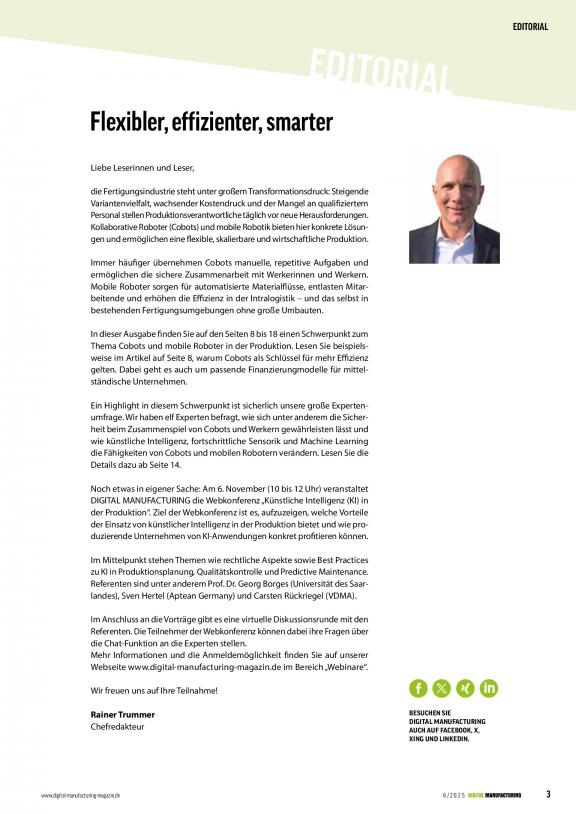 Im Mittelpunkt von DIGITAL MANUFACTURING stehen Grundlagen, Methoden, technische Trends, IT-Lösungen sowie praxisnahe Anwendungsbeispiele aus dem Bereich der digitalen Prozesskette in der Produktion. Das Magazin vermittelt, welche Produktivitätsvorteile sich in der Produktion durch die richtigen Strategien und Lösungen erzielen lassen.