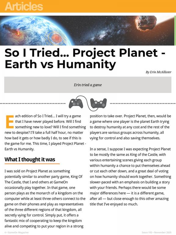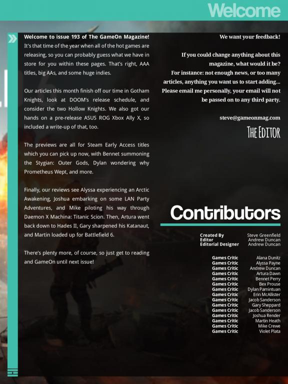 GameOn Magazine is a monthly video game magazine that focuses on everything gaming, from Xbox One, PlayStation 4 and PC. Reviews of games out, previews of games not out yet, interviews with development teams and gaming article, each month is packed with over 30 different features. GameOn Magazine is published by GameOn Networking Ltd. and is available in the UK, the US, in mainland Europe, Australia, New Zealand, South Africa and many other countries. GameOn Magazine features articles on a variety of topics, such as: * Reviews: Reviews of the latest video games, from AAA blockbusters to indie gems. * Previews: Previews of upcoming video games, giving you a sneak peek at what's to come. * Interviews: Interviews with developers, designers, and other industry insiders. * Features: Articles on a variety of gaming-related topics, such as history, culture, and technology. * Columns: Columns by leading gaming journalists and personalities. * Tips and tricks: Tips and tricks to help you improve your gaming skills. GameOn Magazine is a great resource for anyone who loves video games. It is packed with information and inspiration, and it is a must-read for any gamer. Subscribe today and stay up-to-date on the latest gaming news and trends!