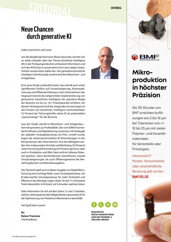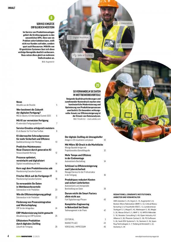 Im Mittelpunkt von DIGITAL MANUFACTURING stehen Grundlagen, Methoden, technische Trends, IT-Lösungen sowie praxisnahe Anwendungsbeispiele aus dem Bereich der digitalen Prozesskette in der Produktion. Das Magazin vermittelt, welche Produktivitätsvorteile sich in der Produktion durch die richtigen Strategien und Lösungen erzielen lassen.