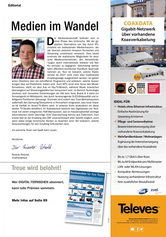 DIGITAL FERNSEHEN ist der erfolgreiche Wegweiser für die Nutzung digitaler Techniken. Das Magazin berichtet über die neuesten Produkte und Entwicklungen in der TV-Branche und informiert die Leser rund um den digitalen Fernsehempfang per Satellit, Kabel, Antenne oder Internet (IPTV). Zudem liegt ein großes Augenmerk auf den neuen interaktiven Medien. VOD-Dienste, Apps, HbbTV sowie Mediatheken gehören zum festen Bestandteil. Techniktipps, Einstellhilfen und Workshops mit Nutzwert für den Leser vervollständigen das Profil. Zahlreiche Hintergrundberichte geben dem Zuschauer Einblicke in die neue multimediale Welt, die Aktivitäten vor und hinter den Kulissen der digitalen TV-Szene werden beleuchtet, die stärkere Vernetzung der Medien nicht außer Acht gelassen. Unsere Redakteure berichten praxisnah über neue Verbreitungsformen und -standards, über interaktive Anwendungen oder digitale Zusatzdienste – ohne auf unverständliche und vor allem unkommentierte Fachsprache zurückzugreifen.