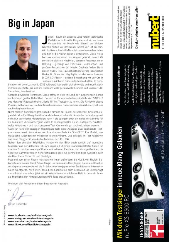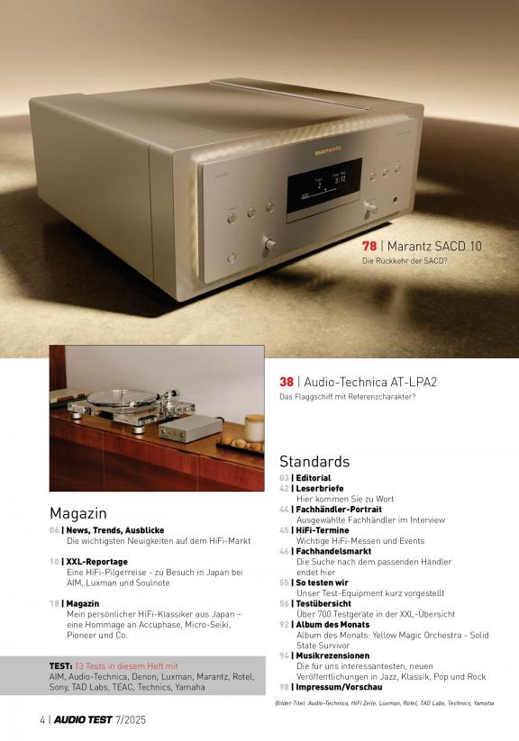 Für jedes Qualitätslevel und jeden Geldbeutel gibt es die passenden Geräte, welche die Redaktion der AUDIO TEST in diesem Ratgeber für den guten Ton vorstellt. Die Themenbereiche umfassen sowohl HiFi als auch Surround, analoge und digitale Audiotechnik, Zubehör sowie lifestylige Ambient-Elemente. Im hochwertig ausgestatteten hauseigenen Testlabor testen unsere Experten mittel- bis hochpreisige Produkte, wobei der Fokus nicht ausschließlich auf fachspezifischen Testtabellen liegt. In praxisnahen Workshops geben wir zahlreiche Insider-Tipps und Einstellungshilfen, berichten über die Innovationen der Audiobranche oder wagen einen Blick hinter die Kulissen traditionsreicher Hersteller. Zielgruppe sind Audiophile Einsteiger und Experten, die Hilfe bei Kaufentscheidungen suchen und bereit sind, viel in eine exklusive HiFi- und Surround-Anlage zu investieren. Engagierte Leser mit Affinität für Produkte und Innovationen im Audiobereich. Leser, die als Meinungsbildner fungieren.