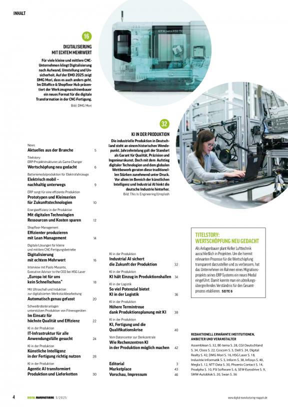 Im Mittelpunkt von DIGITAL MANUFACTURING stehen Grundlagen, Methoden, technische Trends, IT-Lösungen sowie praxisnahe Anwendungsbeispiele aus dem Bereich der digitalen Prozesskette in der Produktion. Das Magazin vermittelt, welche Produktivitätsvorteile sich in der Produktion durch die richtigen Strategien und Lösungen erzielen lassen.