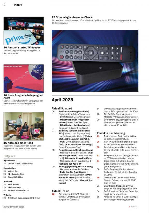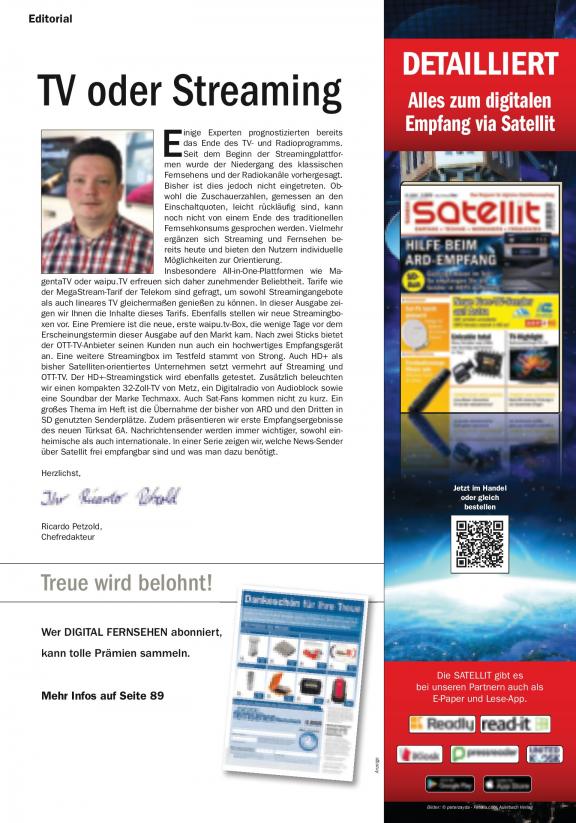 DIGITAL FERNSEHEN ist der erfolgreiche Wegweiser für die Nutzung digitaler Techniken. Das Magazin berichtet über die neuesten Produkte und Entwicklungen in der TV-Branche und informiert die Leser rund um den digitalen Fernsehempfang per Satellit, Kabel, Antenne oder Internet (IPTV). Zudem liegt ein großes Augenmerk auf den neuen interaktiven Medien. VOD-Dienste, Apps, HbbTV sowie Mediatheken gehören zum festen Bestandteil. Techniktipps, Einstellhilfen und Workshops mit Nutzwert für den Leser vervollständigen das Profil. Zahlreiche Hintergrundberichte geben dem Zuschauer Einblicke in die neue multimediale Welt, die Aktivitäten vor und hinter den Kulissen der digitalen TV-Szene werden beleuchtet, die stärkere Vernetzung der Medien nicht außer Acht gelassen. Unsere Redakteure berichten praxisnah über neue Verbreitungsformen und -standards, über interaktive Anwendungen oder digitale Zusatzdienste – ohne auf unverständliche und vor allem unkommentierte Fachsprache zurückzugreifen.
