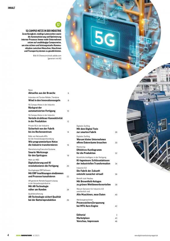Im Mittelpunkt von DIGITAL MANUFACTURING stehen Grundlagen, Methoden, technische Trends, IT-Lösungen sowie praxisnahe Anwendungsbeispiele aus dem Bereich der digitalen Prozesskette in der Produktion. Das Magazin vermittelt, welche Produktivitätsvorteile sich in der Produktion durch die richtigen Strategien und Lösungen erzielen lassen.