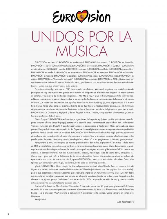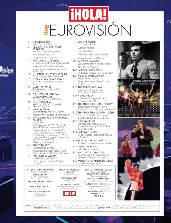 ESPACIAL HOLA España: El semanario del corazón pone a la venta un número dedicado al certamen, de 144 páginas, en el que repasa todas las ediciones y sus grandes estrellas, poniendo énfasis en la representación española, el surgimiento del Benidorm Fest y en la candidatura de RTVE en Basilea, entrevista a Melody incluida