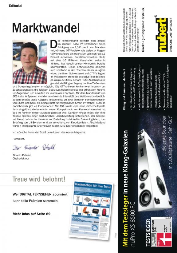 DIGITAL FERNSEHEN ist der erfolgreiche Wegweiser für die Nutzung digitaler Techniken. Das Magazin berichtet über die neuesten Produkte und Entwicklungen in der TV-Branche und informiert die Leser rund um den digitalen Fernsehempfang per Satellit, Kabel, Antenne oder Internet (IPTV). Zudem liegt ein großes Augenmerk auf den neuen interaktiven Medien. VOD-Dienste, Apps, HbbTV sowie Mediatheken gehören zum festen Bestandteil. Techniktipps, Einstellhilfen und Workshops mit Nutzwert für den Leser vervollständigen das Profil. Zahlreiche Hintergrundberichte geben dem Zuschauer Einblicke in die neue multimediale Welt, die Aktivitäten vor und hinter den Kulissen der digitalen TV-Szene werden beleuchtet, die stärkere Vernetzung der Medien nicht außer Acht gelassen. Unsere Redakteure berichten praxisnah über neue Verbreitungsformen und -standards, über interaktive Anwendungen oder digitale Zusatzdienste – ohne auf unverständliche und vor allem unkommentierte Fachsprache zurückzugreifen.