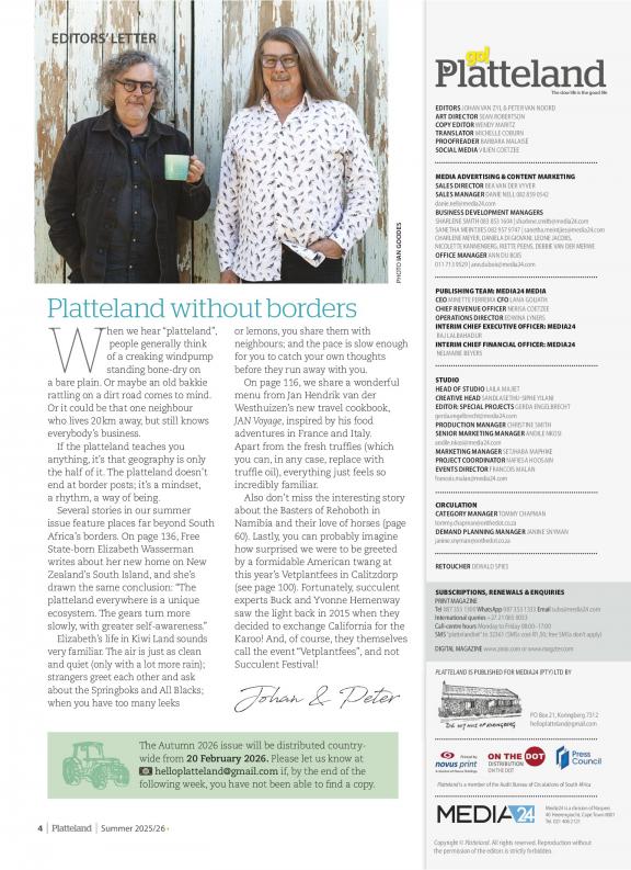 The slow life is the good life: go! Platteland celebrates the rural lifestyle and the entrepreneurial spirit of people whose hearts are in the platteland – whether they grew up in the countryside or are already based there, are contemplating making the move or simply hankering after the rural life. Platteland offers articles that focus on entrepreneurs, DIY projects, animals, gardening, food, towns and people. It is both practical and inspiring – as much of a visual feast as it is a celebration of great writing.