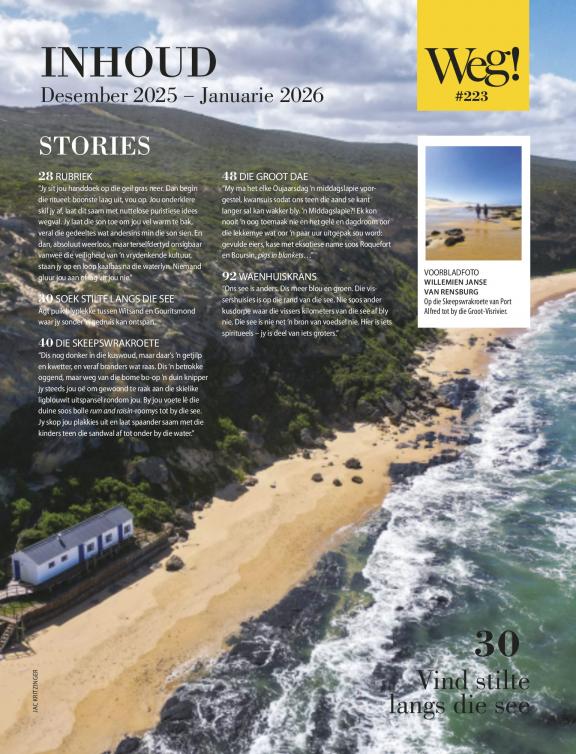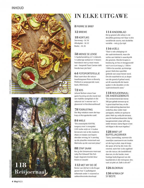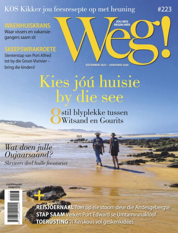 Suid-Afrika se voorste reistydskrif is enige buitelewemens se paspoort tot bekostigbare bestemmings en blyplek in Suidelike-Afrika. Elke uitgawe is volgepak met puik foto’s en gesaghebbende stories oor interessante mense en plekke (en wat om daar te doen). Kamp, voetslaan, fotografie, toerusting, kos, die langpad, en avontuur is ook deel van Weg se DNS. En omdat ons nie freebies aanvaar nie en self vir alles betaal, weet lesers hulle kan ons inligting vertrou. Of jy wil wegbreek vir die naweek of ’n lang vakansie, jou reis begin hier...