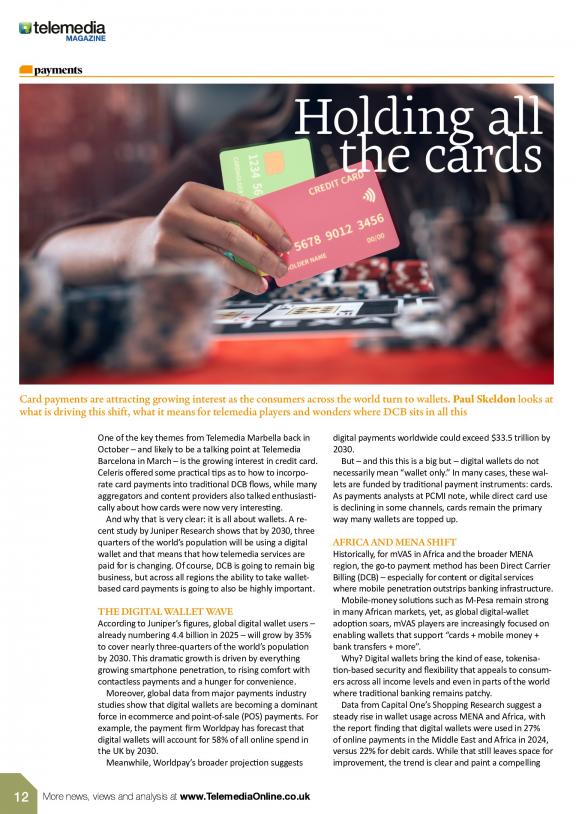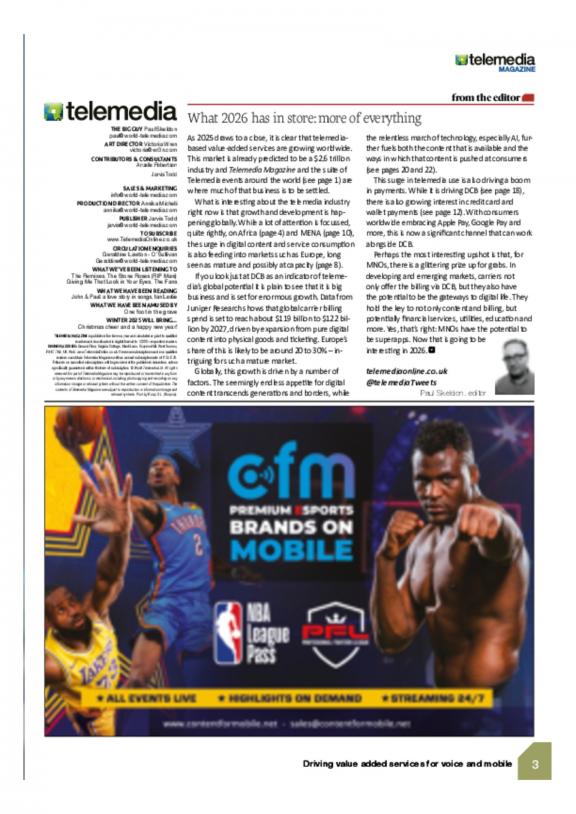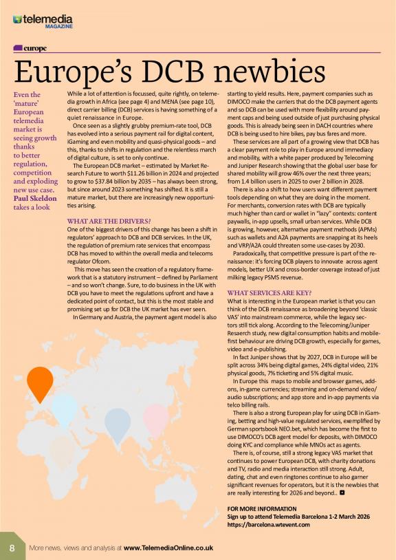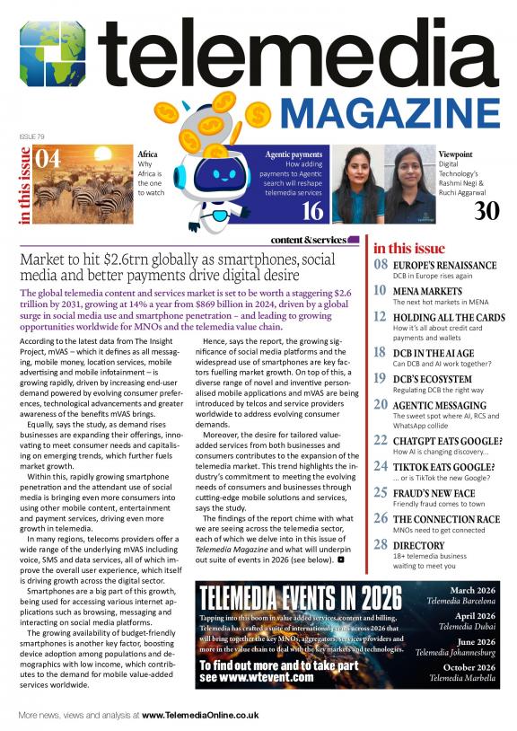 Telemedia Magazine is for any business that wishes to engage and commercialize “connected consumers” using mobile devices to respond or interact with value added services, premium content and applications. We report on how carrier billing and other alternative payment platforms continue to evolve and, in partnership with Service Providers and Aggregators – form part of the “Telemedia” value chain which is typically underpinned by minutes, messages and traffic. Published in print and online; essential reading for Merchants, Media and Content Owners – who want seamless micropayment solutions and engagement tools; that can immediately convert sales across the globally expanding range of Media, Affiliate and Advertising networks.