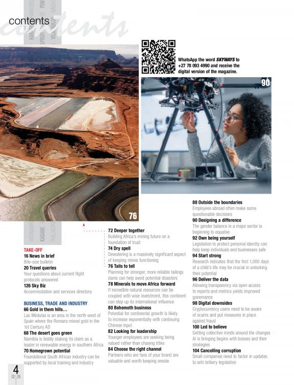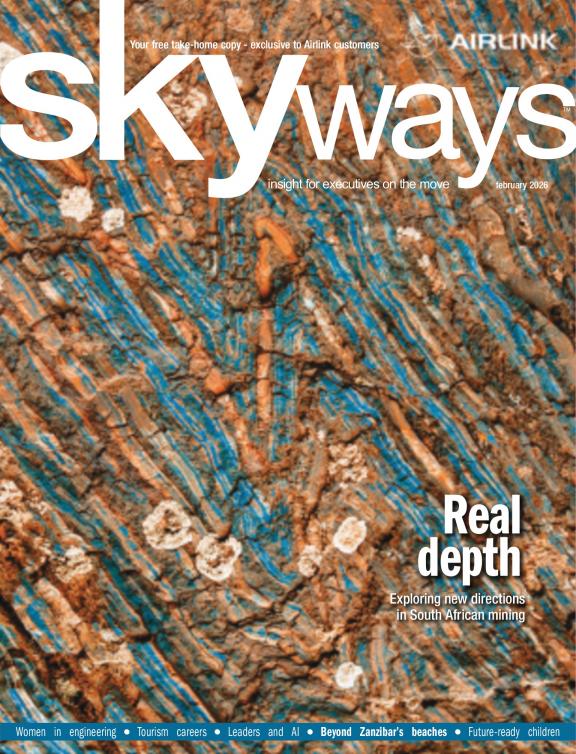 Skyways, the in-flight entertainment magazine exclusive to Airlink, is published with the business traveller in mind. The publication offers an unrivalled opportunity to promote, advertise and communicate with the captains of industry of Southern African business. Today, Airlink flies to more local destinations than any other regional airline, operating over 4,000 flights per month and servicing more than 37 destinations in Southern Africa. Airlink carries more than 1,400,000 passengers on more than 40 routes, completing by way of 46,000 flight missions annually and providing convenient connections through their alliance with SAA and the Star Alliance carrier’s global networks throughout Southern Africa and the world. Skyways’ editorial coverage is different from other in-flight magazines – it takes a left-brain thinking approach to provide content that is thought-provoking, educational and, at the same time, entertaining.