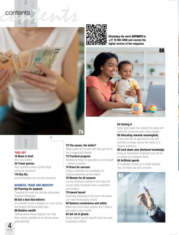 Skyways, the in-flight entertainment magazine exclusive to Airlink, is published with the business traveller in mind. The publication offers an unrivalled opportunity to promote, advertise and communicate with the captains of industry of Southern African business. Today, Airlink flies to more local destinations than any other regional airline, operating over 4,000 flights per month and servicing more than 37 destinations in Southern Africa. Airlink carries more than 1,400,000 passengers on more than 40 routes, completing by way of 46,000 flight missions annually and providing convenient connections through their alliance with SAA and the Star Alliance carrier’s global networks throughout Southern Africa and the world. Skyways’ editorial coverage is different from other in-flight magazines – it takes a left-brain thinking approach to provide content that is thought-provoking, educational and, at the same time, entertaining.