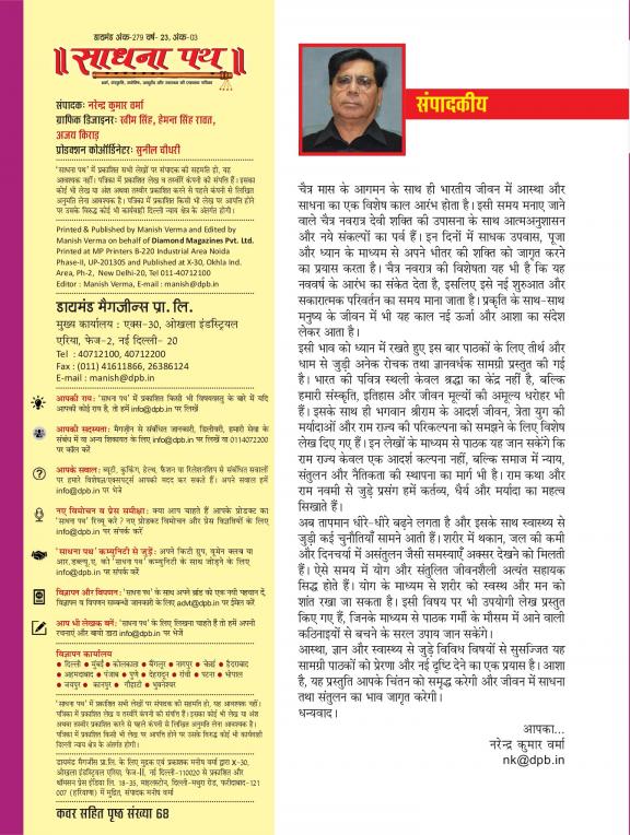 Sadhna Path is a health and wellness magazine which also covers spirituality and ayurveda in collaboration with Sadhna Channel. Sadhna Path is an endeavour taken under the aegis of Diamond magazines, to make discerning and callous people stop aping the West blindly and realise their country's worth. It is a monthly Hindi transformative magazine being published for the last eight years, covering religion, astrology, spirituality, vaastu and Feng Shui. It is a complete magazine for your mind, body and soul.