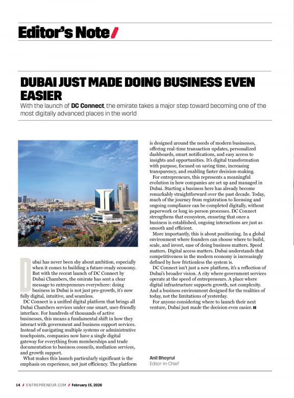 Entrepreneur Middle East is the guide for the region's entrepreneurs and business-minded readership. A regional business magazine based out of Dubai, United Arab Emirates, Entrepreneur Middle East is the flagship publication of BNC Publishing, officially licensed by the US-based business and growth publication, Entrepreneur.