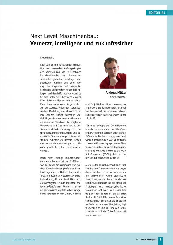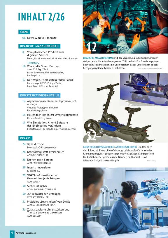 Die herstellerunabhängige Fachzeitschrift wendet sich an alle Anwender und Entscheider,die mit Softwarelösungen von Autodesk arbeiten. Das Magazin gibt praktische Hilfestellung bei der Auswahl, Einführung und dem Betrieb von Soft- und Hardware. Im Fokus stehen ebenso Lösungen aus den Bereichen Antriebstechnik, Automation, E-Technik, Fluid- und Verbindungstechnik.