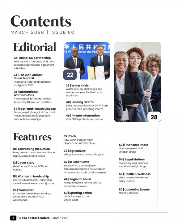 senior leaders in public service and the public sector in general, Public Sector Leaders speaks to an audience with the highest level of authority - government decision-makers. With a digital readership of 40 000 monthly, Public Sector Leader is the only specialised platform that offers a window of opportunity for marketers and communicators in both the public and private sectors to engage with an audience of senior government officials. As a group, this audience presides over a procurement budget of more than R150 billion per annum and their requirement list includes both products and services from the corporate sector. Their procurement decisions range from acquiring technology solutions, legal services, performance tools, audit services, communication solutions, catering services, security, office equipment, buildings and facilities, environmental products, waste-management solutions and general products. The Purpose of the Brand: Celebrating and showcasing trusted ethical and best practice in the public sector to an African & global audience - highlighting innovation, policy making and community initiatives Shining an independent light on what public servants are doing Our goal is to start in South Africa and grow into Africa